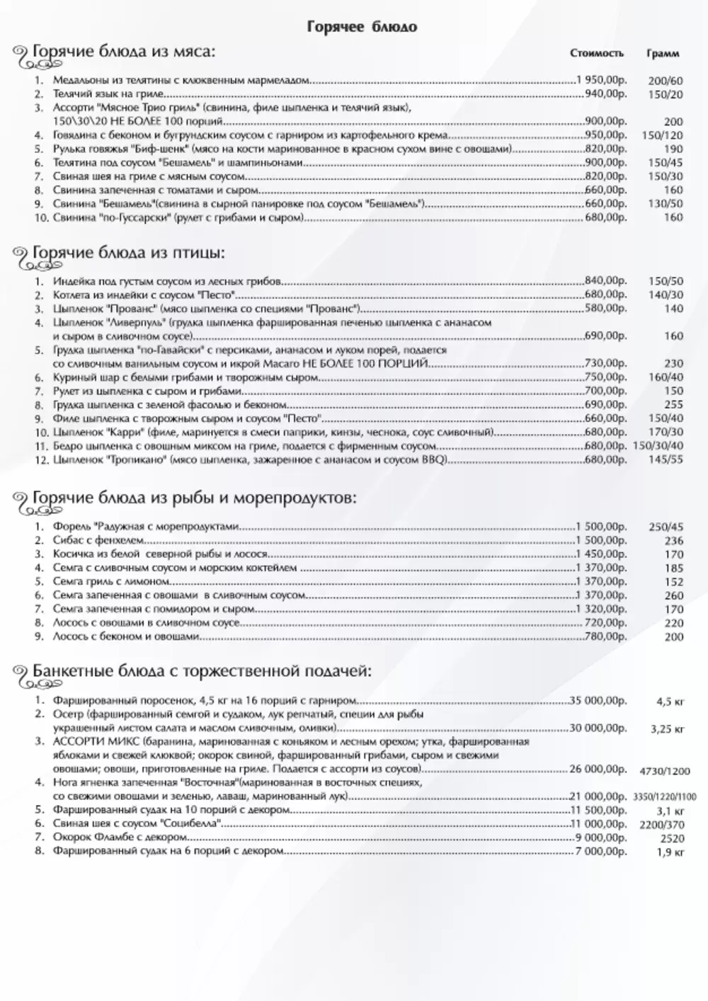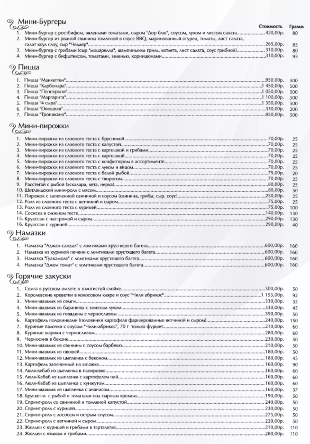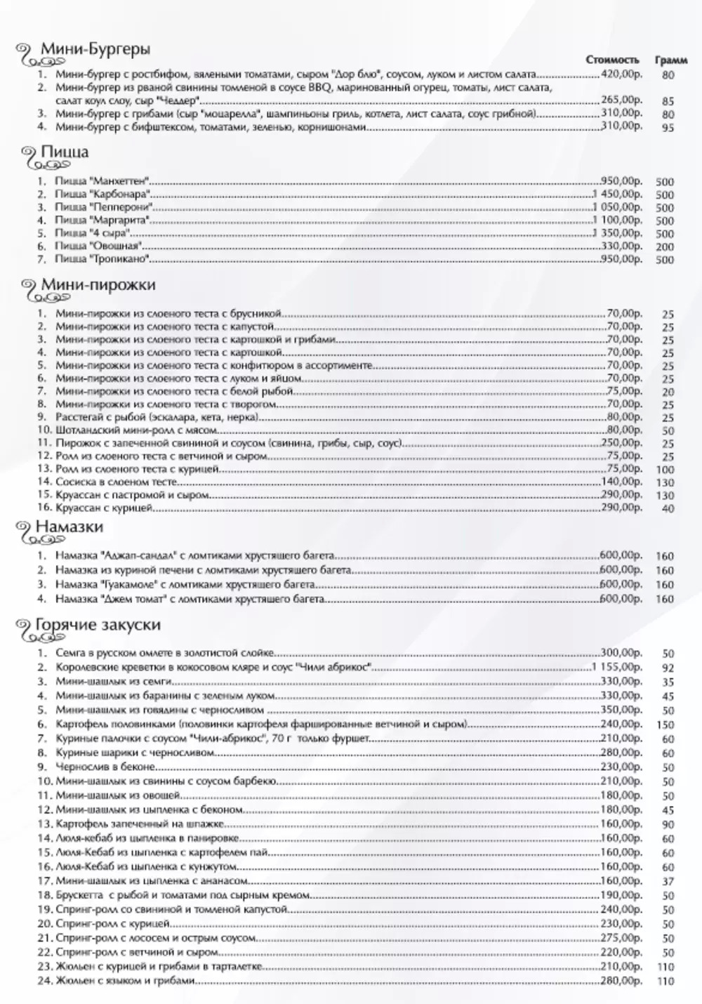 С нашей сетью вы можете больше не переживать по таким вопросам) потому что банкетный менеджер, выбранной вами площадки, всегда вам поможет в составлении меню, подходящего под ваш запрос, бюджет и особенности мероприятия!