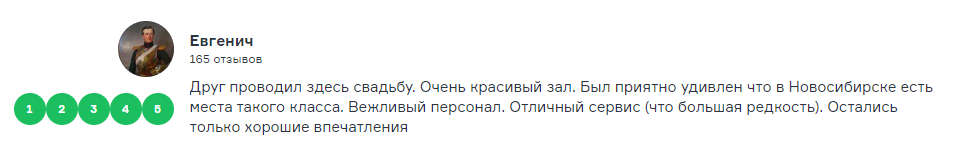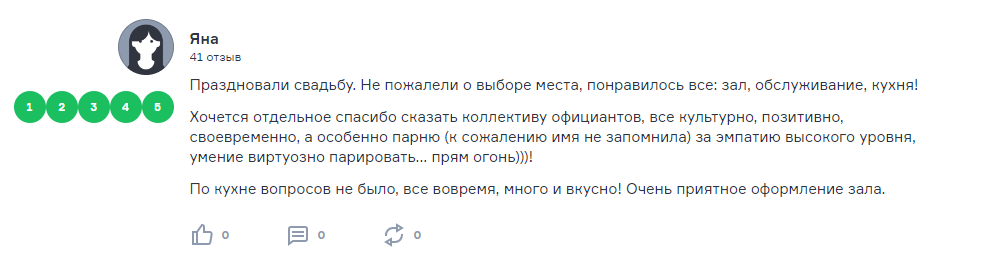 Вот что нам предоставила наша Служба заботы, которая проводит опрос среди наших гостей, после проведения мероприятий в наших залах (по 5 бальной шкале):